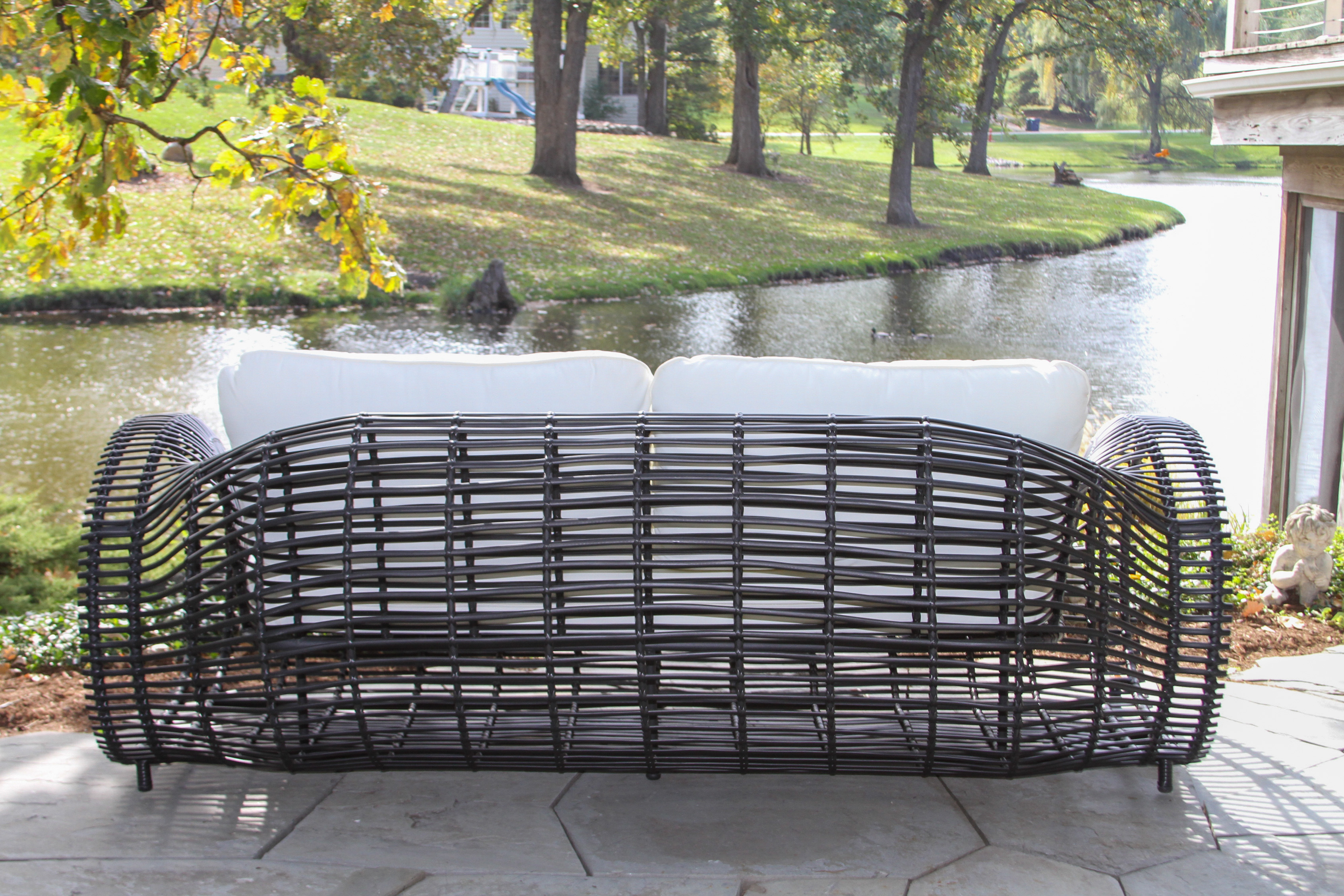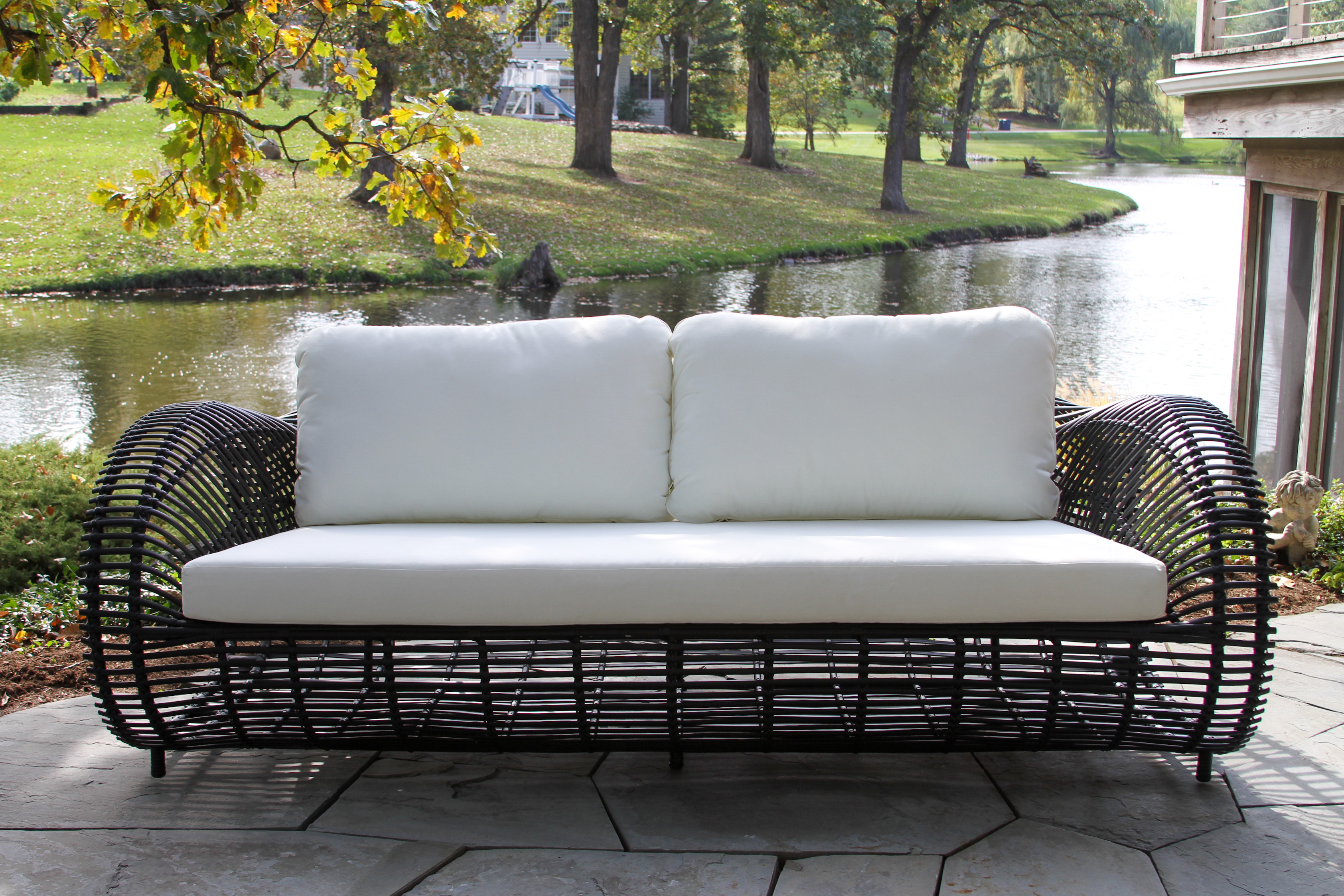 The sofa is made with HDPE all-weather wicker handwoven around a powder-coated aluminum frame. The sofa has Sunbrella-branded cushions for versatile comfort and style. The sofa comes fully assembled and requires little maintenance!