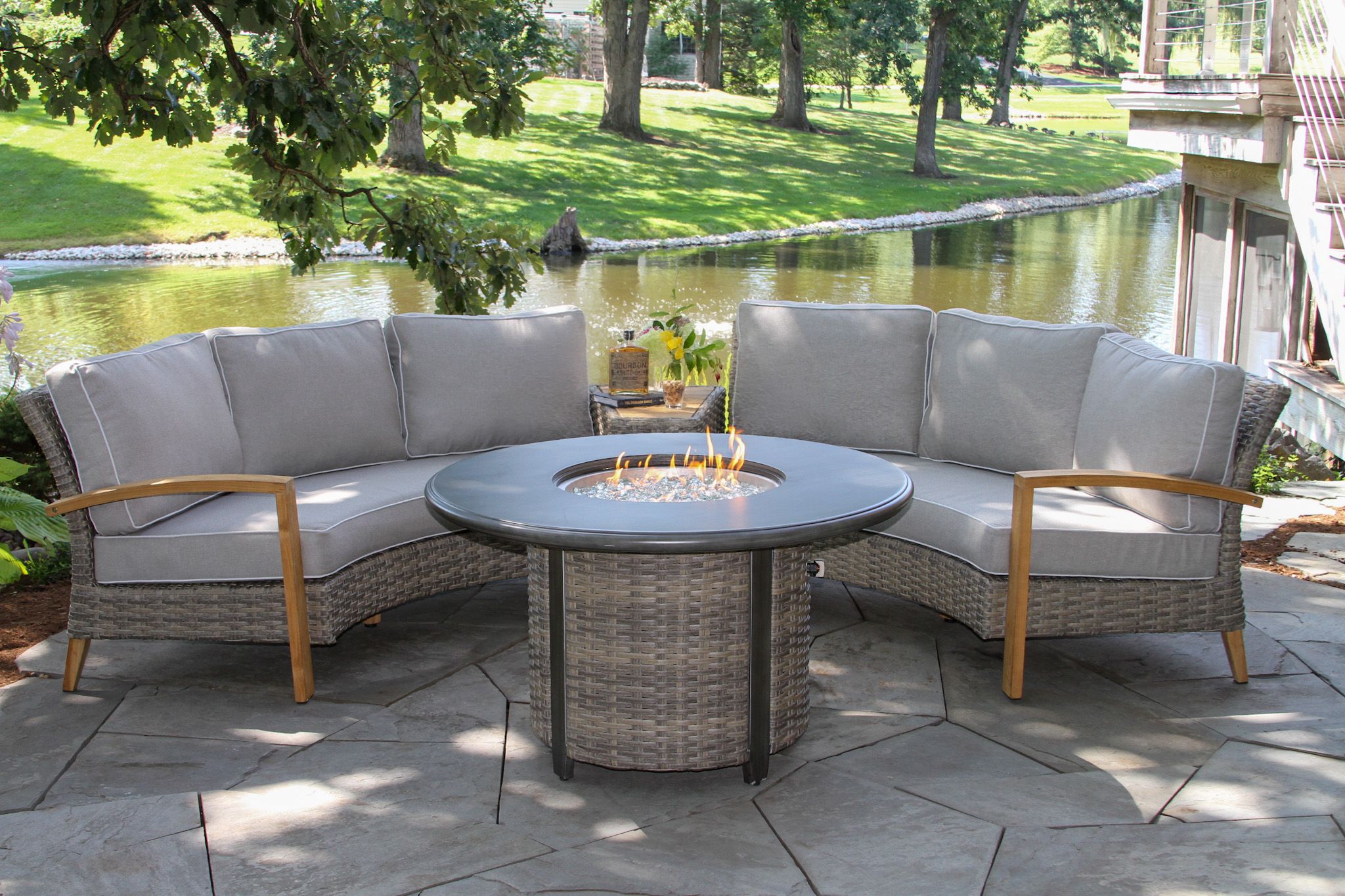 The 3 pc. The teak and Wicker Half-Round Sofa set provides the perfect arrangement for circular patios, a matching fire pit (F7668), or with our matching 36″ Coffee Table (TNA7644). Our half-round sectional provides all the comfort and style of other items in our Vineyard Collection. You can mix and match this sofa with our storage sectional (TNA7900-G), armchair (TNA7902-GC), footstool (TNA7901-GF), and accent table (TNA7903-GA).